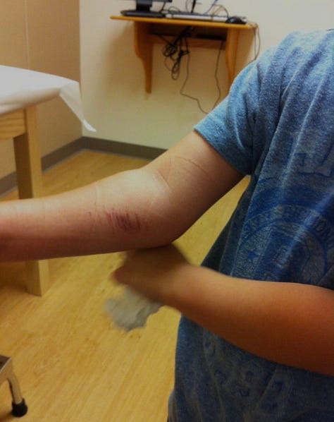 When he got there, the nurse looked at the scrape on his elbow, cleaned it with alcohol, covered it with antibiotic ointment and a bandage, and then made him bend and straighten his arm a few times. He winced and held his breath - he demonstrated that part later - and let her know it really hurt, but she told him he was fine and that he should go back to class.