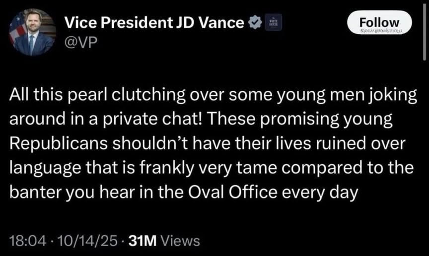 This is noteworthy, because the man second in line to the presidency put his gaslighty-arrogant-punch-me-in-the-face pants on, and said kids say dumb things all the time, and especially boys, and he was going to teach his sons not to put anything like this on the internet (how about you teach them not to be racist, bigoted lowlifes and then you won’t have to worry about what they say to friends in a group chat, JD!) because you never know when some “scumbag” is going to leak it to try to ruin you or your family.